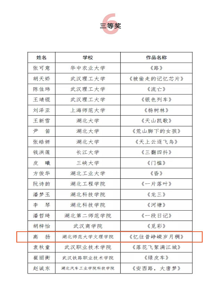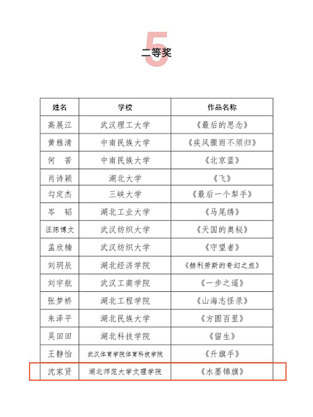 日前,由湖北省作家协会、湖北省学生联合会举办的湖北省高校第十八届“福创杯”新青年小说大赛落幕,我校学子沈家贤和高扬分获二、三等奖,人文学部主任熊子延教授获得优秀指导教师奖。