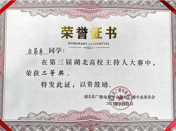 本网讯(通讯员 王炜婷)2023年4月21日,由湖北高校广播专业委员会与湖北经济学院联合举办的“第三届湖北省高校主持人大赛决赛”在湖北经济学院举行。我校理工学部信息安全技术应用2201班台昂卓同学在比赛中荣获二等奖。