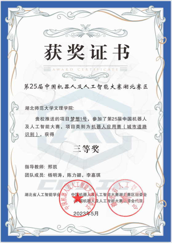 本网讯 (通讯员 邢凯)5月13日-14日,2023年湖北省人工智能大赛暨第二十五届中国机器人及人工智能大赛(湖北赛区)在武汉工程大学举行,我校由邢凯老师指导,杨明涛、陈力勰、李嘉琪三名学生组成的团队荣获三等奖。
