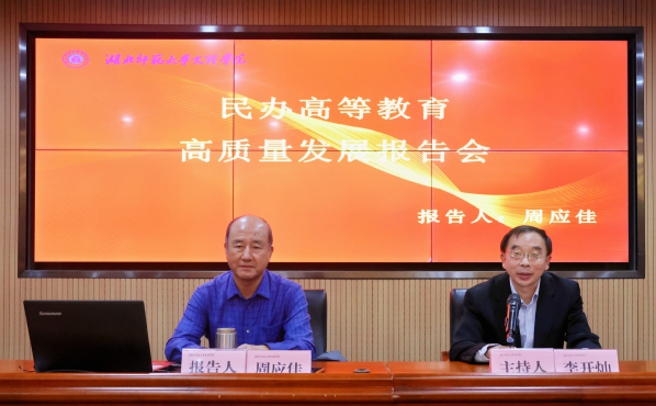 为推动学校高质量发展,11月8日下午,我校邀请湖北省高等教育学会会长周应佳教授在图书馆报告厅作了题为“民办高等教育高质量发展”的专题报告。报告会以“提升内涵,发展特色,推动民办高校高质量发展”为主题。董事长李咏成,全体校领导,全校行政管理人员参加了会议。会议由院长李开灿主持。